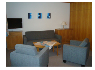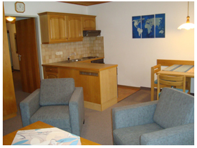 Apartmán má předsíň, obývací pokoj s kuchyňským koutem a se dvěma rozkládacími gauči pro 2-4 osoby, koupelnu se sprchovým koutem a WC, Sat-TV, balkon. K tomuto apartmánu náleží jedno parkovací místo v podzemních garážích.