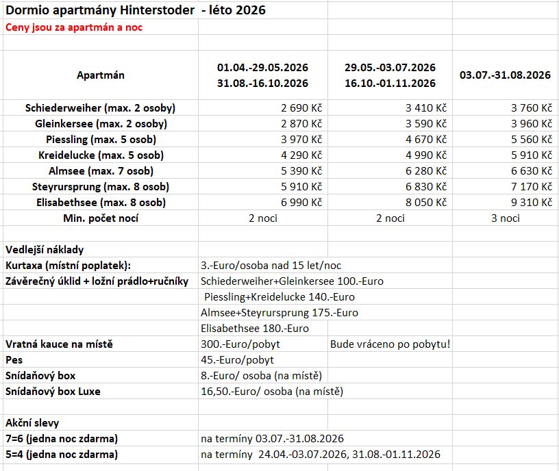 Apartmány Dormio se nachází v idylickém alpském středisku v Horním Rakousku, které v létě okouzlí působivou horskou kulisou, křišťálově čistými potoky a zelenými alpskými pastvinami. Turistické stezky vedou k panoramatickým výhledům na pohoří Totes Gebirge, zatímco jezero Schiederweiher – často oceňované jako „nejkrásnější místo Rakouska“ – je oblíbeným cílem milovníků přírody.