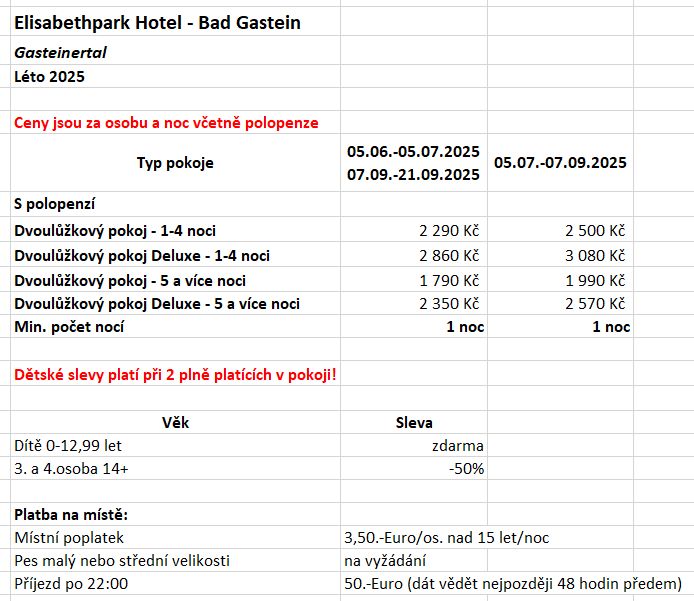 Hotel Elisabethpark se nachází v centru Bad Gasteinu, v bezprostřední blízkosti známých termálních pramenů a ikonických Gasteinských vodopádů. Nabízí elegantně zařízené pokoje, wellness centrum s krytým termálním bazénem i a relaxační zónou, restauraci s panoramatickým výhledem, stylový bar a vlastní hotelový park. Hotel je starší, včetně vybavení, ale ideální polohou pro relaxaci i aktivní dovolenou v údolí, městečku Gastein a výlety do okolí. Mezi oblíbené výletní cíle v okolí patří Gasteinské termální lázně, hora Stubnerkogel s visutým mostem, vyhlídka Glocknerblick, oblast Sportgastein, hrad Klammstein, soutěska Liechtensteinklamm, vrchol Schlossalm, vodopády Krimml a ledovec Kitzsteinhorn.
