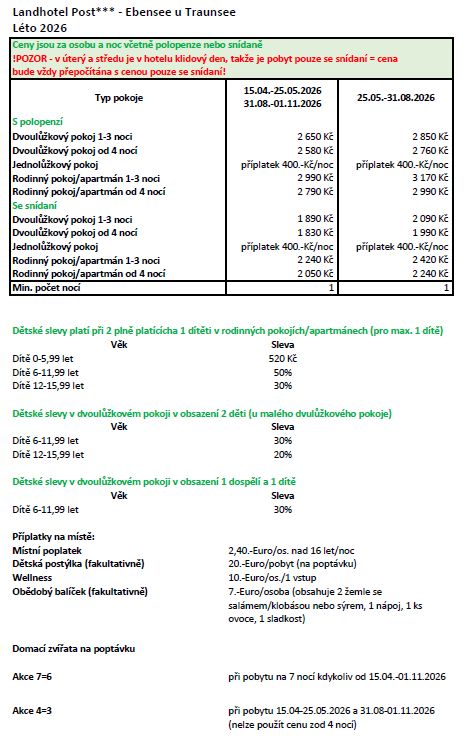 Hotel Landhotel Post*** se nachází v malebném městečku Ebensee v rakouských Alpách, u jezera Traunsee. Tento hotel nabízí pohodlné a útulné ubytování pro hosty, kteří hledají klidné prostředí a možnost aktivní dovolené v přírodě. Vzdálenost hotelu od jezera Traunsee je pouze několik minut chůze. Pláže u jezera jsou přístupné a ideální pro odpočinek a relaxaci během letních měsíců. Landhotel Post má k dispozici různé typy pokojů, které jsou vkusně zařízené a moderně vybavené. Hosté zde najdou pokoje s výhledem na jezero, hory nebo do zahrady. K dispozici jsou také apartmány, ideální pro rodiny nebo skupiny.