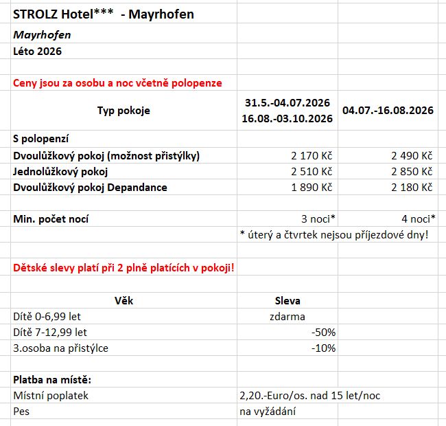 Hotel Strolz se nachází v klidné části Mayrhofenu, přibližně 10 minut chůze od centra města a lanovek Penkenbahn a Ahornbahn. Nabízí pohodlné pokoje v tradičním alpském stylu, wellness centrum se saunou, parní lázní (za poplatek) a krytým bazénem (vstup do bazénu v ceně), restauraci s bohatými snídaněmi i večeřemi a krásnou, zahradu s lehátky. Hosté ocení příjemnou rodinnou atmosféru, výhodnou polohu, blízkost turistických tras i možnost relaxace po aktivním dni. Mezi oblíbené výletní cíle v okolí patří lyžařská oblast Mayrhofen, ledovec Hintertux, soutěska Stilluptal, hora Ahorn s vyhlídkou Adlerblick, horská silnice Zillertaler Höhenstraße, vodopády Krimml, jezero Schlegeis, údolí Zillergrund a horská chata Olpererhütte. Jednoduché, ale útulné pokoje. Široká nabídka služeb v ceně ubytování.