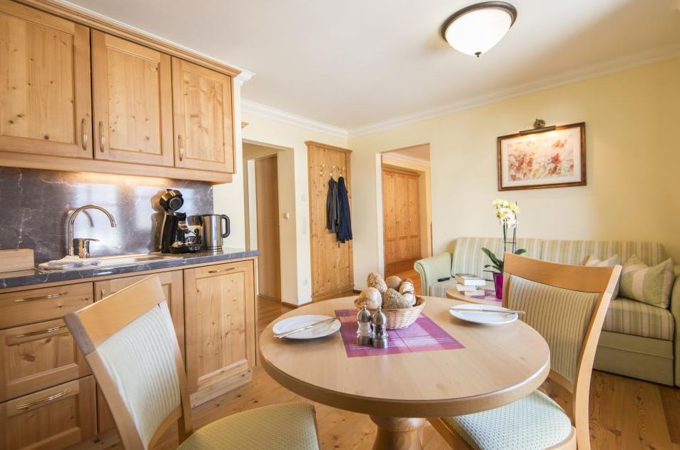 Na ploše 60 m² se může ubytovat čtyři až šest osob. Modřínová podlaha vytváří útulnou a příjemnou atmosféru již při vstupu. Větší část tvoří obytné studio s prostorem na spaní a obývací částí. K dispozici je také samostatný dvoulůžkový pokoj. Velký sprchový kout s podlahovým vytápěním nabízí čistý komfort, stejně jako osvětlené kosmetické zrcadlo s fénem a integrované rádio v koupelně. Aparmtán nabízí také přízemní terasu s rohovým oknem, které nabízí nerušený výhled na hory. Na zahradu s plaveckým biotopem se dostanete ihned z apartmánu, protože se nachází v přízemí.