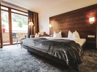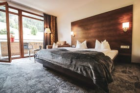 Suita s manželskou postelí a přímým vstupem na soukromou terasu, výhled na ledovec Kitzsteinhorn. Vybavení - obývací pokoj s kvalitní pohovkou, minibar, psací stůl, posezení, telefon, 2x kabelová TV, WiFi, trezor, prostorná koupelna s vanou, fénem, županem, ručníkový servis, samostatné WC.