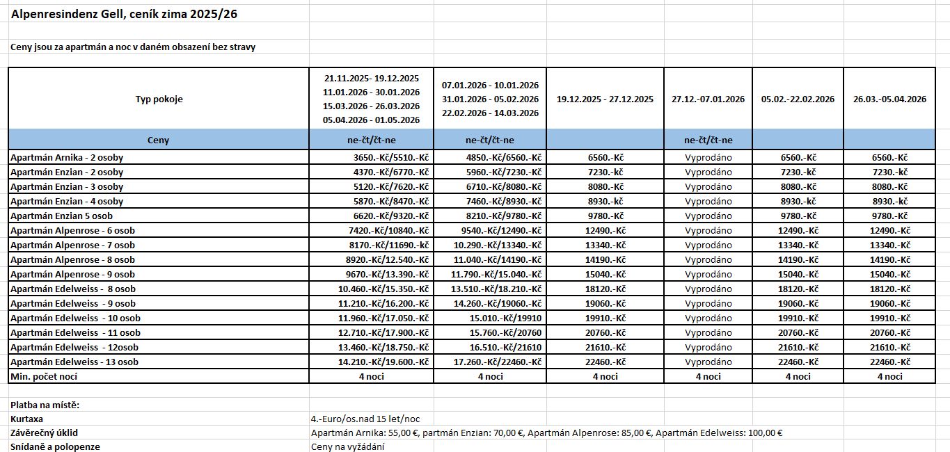 Alpenresidenz Gell se nachází v klidné vesničce Tweng v oblasti Lungau, jen pár minut jízdy od vyhlášeného lyžařského střediska Obertauern a ski areálu Großeck-Speiereck/Katschberg. Nabízí komfortní apartmány v alpském stylu, vybavené koupelnou, satelitní TV, Wi-Fi, trezorem a většina z nich má také balkon s výhledem na zasněžené hory. Hosté mohou využít finskou venkovní saunu, vnitřní biosaunu a příjemnou relaxační zóna, lyžárnu. Výhodou je poloha v nadmořské výšce přes 1 000 m s rychlým přístupem na sjezdovky i běžecké tratě a zastávkou skibusu přímo u hotelu. Mezi nejbližší zimní atrakce a výletní cíle patří lyžařská oblast Obertauern, skiareál Großeck-Speiereck, skiareál Katschberg, zimní turistické stezky v Lungau, městečko Mauterndorf s historickým hradem, město Tamsweg, termální lázně Altenmarkt nedaleko na dojezd autem!