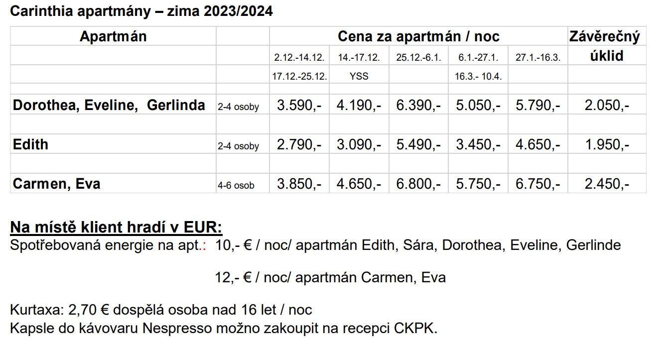 (cena je za apartmán/noc, cena zahrnuje program!, pro opening platí cena označena YSS):