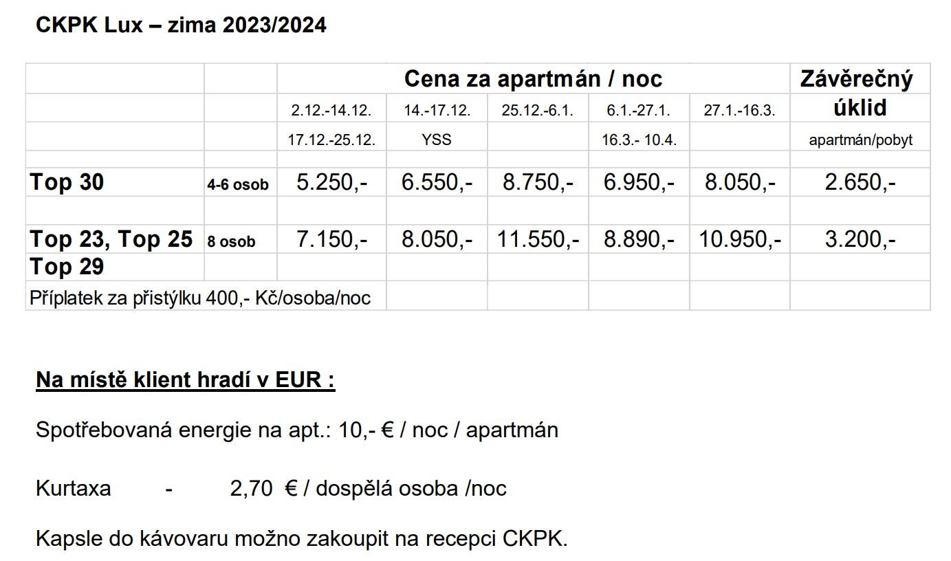 (cena je za apartmán/noc, cena zahrnuje program!, pro opening platí cena označena YSS):