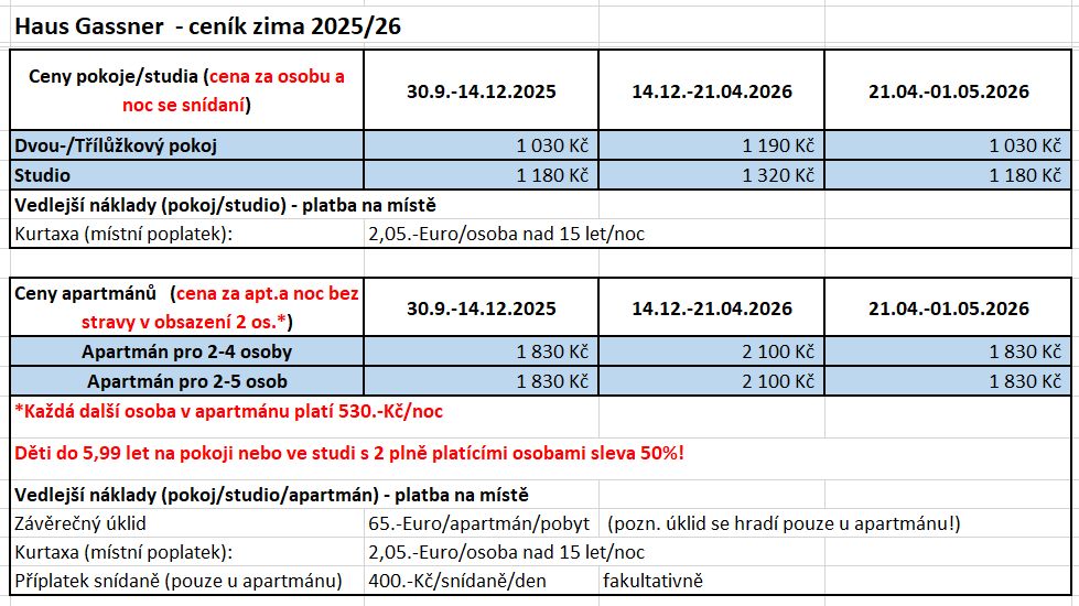 - Děti do 6 let v pokoji/studiu s 2 plně platícími osobami sleva 50%!