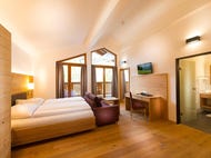 Dvoulůžkový pokoj XL 2-5 osob 40 m2 Tento prostorný pokoj nabízí ubytování až pro pět osob s manželskou postelí, jednolůžkovou postelí a rozkládací pohovkou pro dva. Pohodlné posezení, elegantní dřevěné podlahy, koupelna s vanou a balkon s nádherným výhledem na horu Hochkönig zajišťují pohodlí a příjemnou atmosféru – ideální pro rodiny nebo páry, které ocení dostatek prostoru a pohodlí.