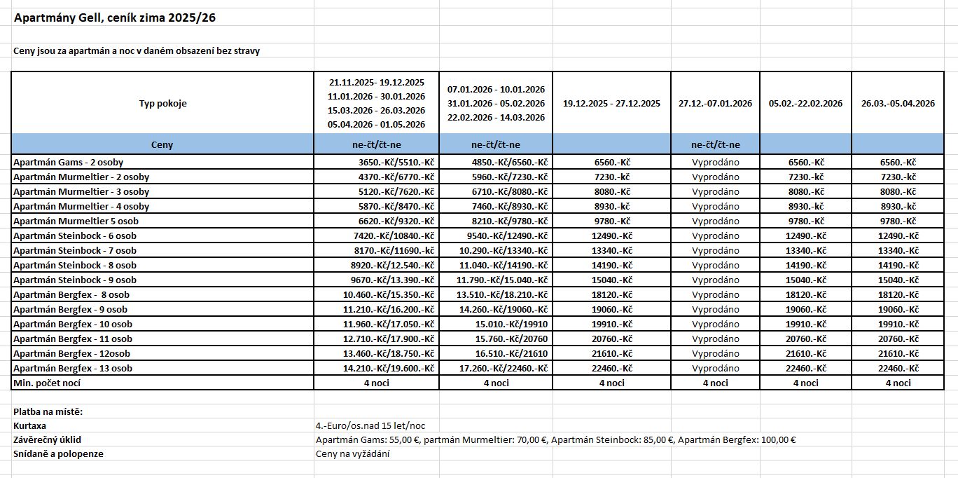 Apartmány Gell se nacházejí v klidné vesničce Tweng v regionu Lungau, v blízkosti známého lyžařského střediska Obertauern a jen několik minut jízdy od ski areálu Großeck-Speiereck/Katschberg. Nabízejí komfortní ubytování v prostorných apartmánech s plně vybavenou kuchyní, obývacím koutem, satelitní TV, trezorem, Wi-Fi připojením a většinou také balkonem s krásným výhledem na okolní hory. Hosté mohou využít wellness se saunou, vířivkou a relaxační zónou, dětskou hernu, společenskou místnost i bezplatné parkování. Výhodou je klidná poloha v nadmořské výšce kolem 1 000 m, ideální pro zimní dovolenou na lyžích i letní turistiku. V okolí se nachází lyžařská oblast Obertauern, skiareál Großeck-Speiereck, skiareál Katschberg, jezero Twenger Almsee, horské stezky v pohoří Radstädter Tauern, městečko Mauterndorf s historickým hradem, město Tamsweg, termální lázně Altenmarkt a vyhlídkové túry v biosférickém parku Lungau.