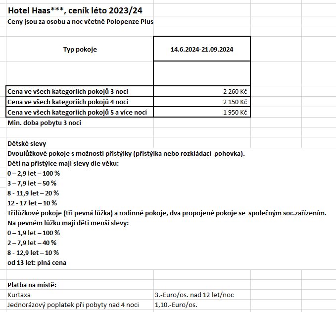 - Polopenze PLUS (v rozsahu uvedeném níže)