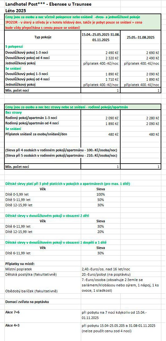 Hotel Landhotel Post*** se nachází v malebném městečku Ebensee v rakouských Alpách, u jezera Traunsee. Tento hotel nabízí pohodlné a útulné ubytování pro hosty, kteří hledají klidné prostředí a možnost aktivní dovolené v přírodě. Vzdálenost hotelu od jezera Traunsee je pouze několik minut chůze. Pláže u jezera jsou přístupné a ideální pro odpočinek a relaxaci během letních měsíců. Landhotel Post má k dispozici různé typy pokojů, které jsou vkusně zařízené a moderně vybavené. Hosté zde najdou pokoje s výhledem na jezero, hory nebo do zahrady. K dispozici jsou také apartmány, ideální pro rodiny nebo skupiny.