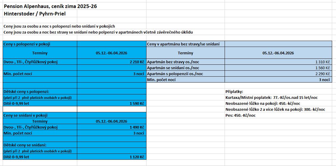 Pension Alpenhaus se nachází v klidné obci Vorderstoder v oblasti Pyhrn-Priel v Horním Rakousku, přibližně 10 minut autem od lyžařského areálu Hinterstoder. Díky poloze pod vrcholem Tamberg nabízí nádherný panoramatický výhled na zasněžené vrcholky pohoří Totes Gebirge a údolí s lanovkami. Tento rodinný penzion nabízí ubytování v útulných pokojích s vlastní koupelnou, satelitní TV a bezplatným Wi-Fi. Součástí je jídelna, společenská místnost s barem i dětský koutek, kde si rodiny po dni na svahu odpočinou. K dispozici je bufetová snídaně, možnost večeří, parkování přímo u domu a úschovna lyží. Pension Alpenhaus je díky své poloze, komfortnímu zázemí a rodinné atmosféře ideální volbou pro zimní dovolenou v oblasti Hinterstoderu.
