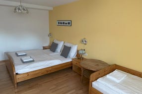 2x 5-7 lůžkový pokoj - - 2 ložnice: rodičovská s manželskou postelí (možnost dalších 2 lůžek), dětský pokoj s palandou a samostatným lůžkem Koupelna s WC a sprchovým koutem, většinou s fénem SAT-TV a balkon Snídaně / Polopenze