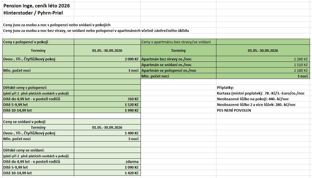 Pension Inge se nachází v klidné části Hinterstoderu, přibližně 1 km od centra města a 2 minuty autem od lyžařského areálu a lanovel Hinterstoder. Tento rodinný penzion nabízí ubytování v pokojích a apartmánech s vlastní koupelnou, satelitní TV, minibarem, trezorem a bezplatným Wi-Fi ve společných prostorách. Pro hosty je k dispozici sauna, společenská místnost, sluneční terasa a parkovací místa u penzionu. V letní sezóně obdrží hosté zdarma kartu Pyhrn-Priel AktivCard, která umožňuje bezplatné využívání lanovek, vstupy na koupaliště, regionální autobusovou dopravu a slevy na různé aktivity. Mezi oblíbené výletní cíle v okolí patří jezírko Schiederweiher, vyhlídka Spitzmauer, soutěska Dr. Vogelgesang-Klamm, hora Großer Priel, jezero Gleinkersee, lanovka na Wurzeralm, město Windischgarsten a klášter Kremsmünster.