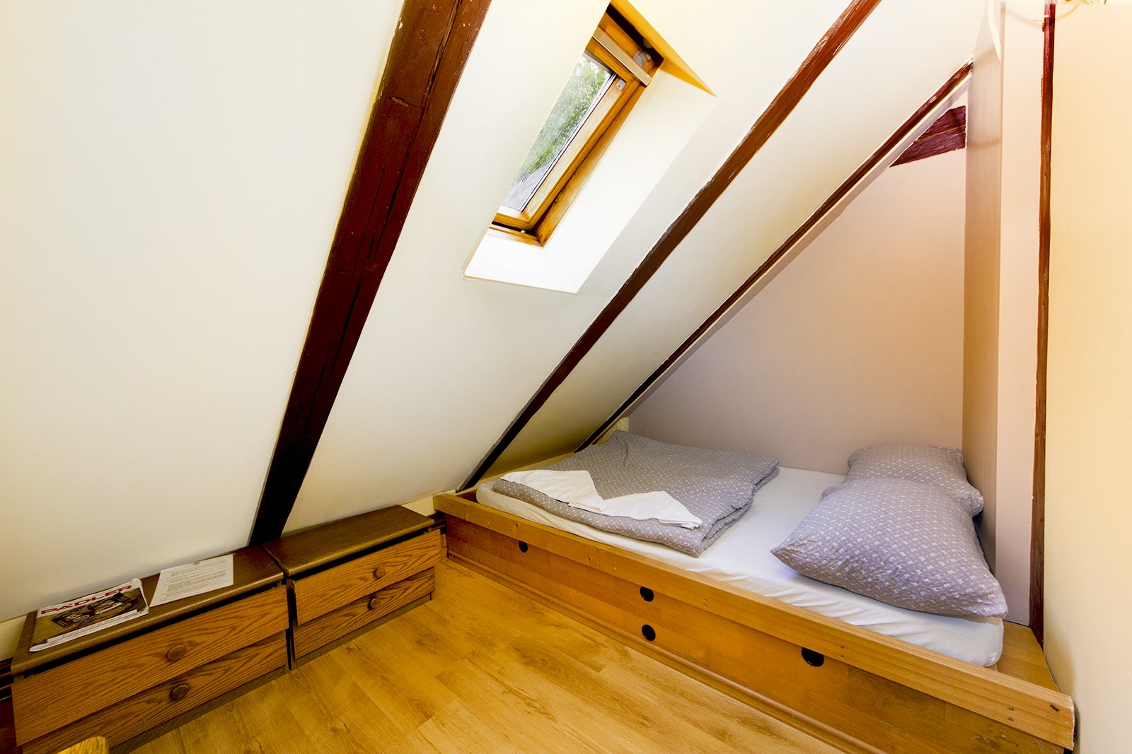 Pokoj č.7: je orientován na jih a je vybaven střešním oknem. V pokoji jsou 2 dvoupatrové postele a manželská postel, nabízí tak místo pro 4-6 osob. Ve výbavě pokoje je 1 šatní skříň a koupelna se záchodem, sprchou a umyvadlem.