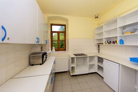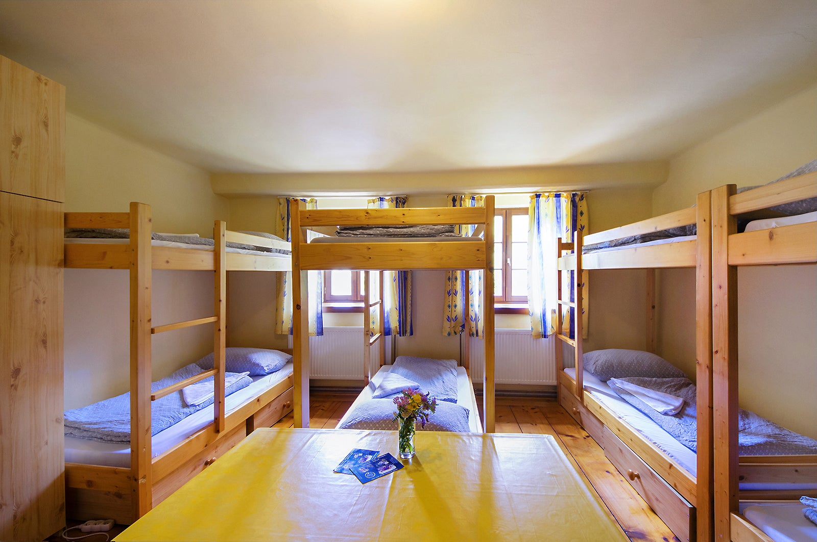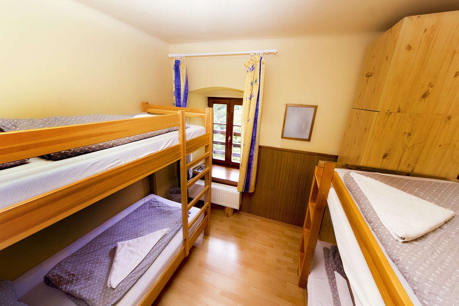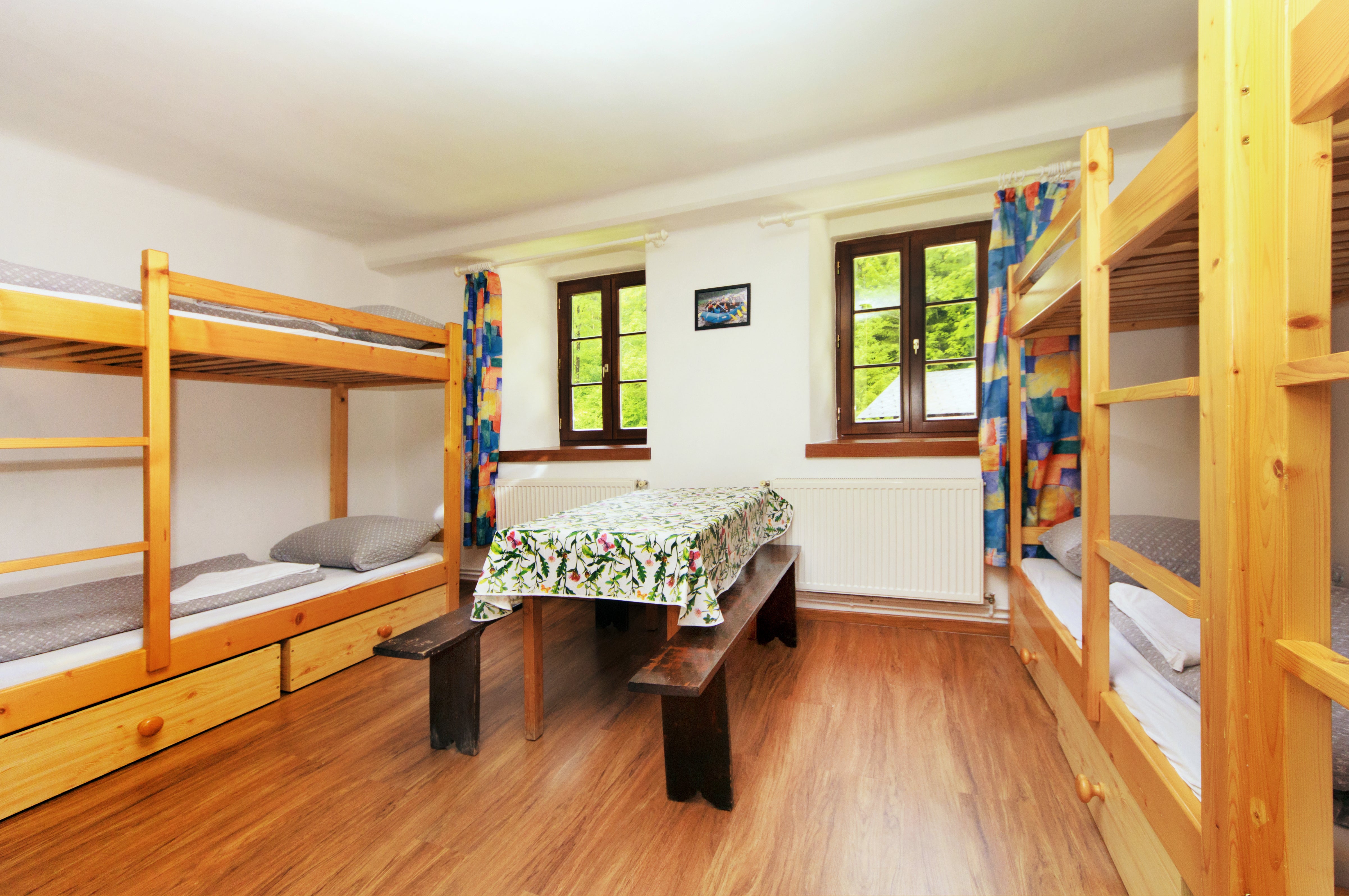 Pokoj č.1: Pokoj s více postelemi a výhledem na jižní stranu (směrem k řece) nabízí prostor pro 5-10 osob. Pokoj je vybaven 5ti patrovými postelemi, stolem s lavicemi, a dvěma skřněmi. Koupelna se sprchou, záchodem a umyvadlem na pokoji.