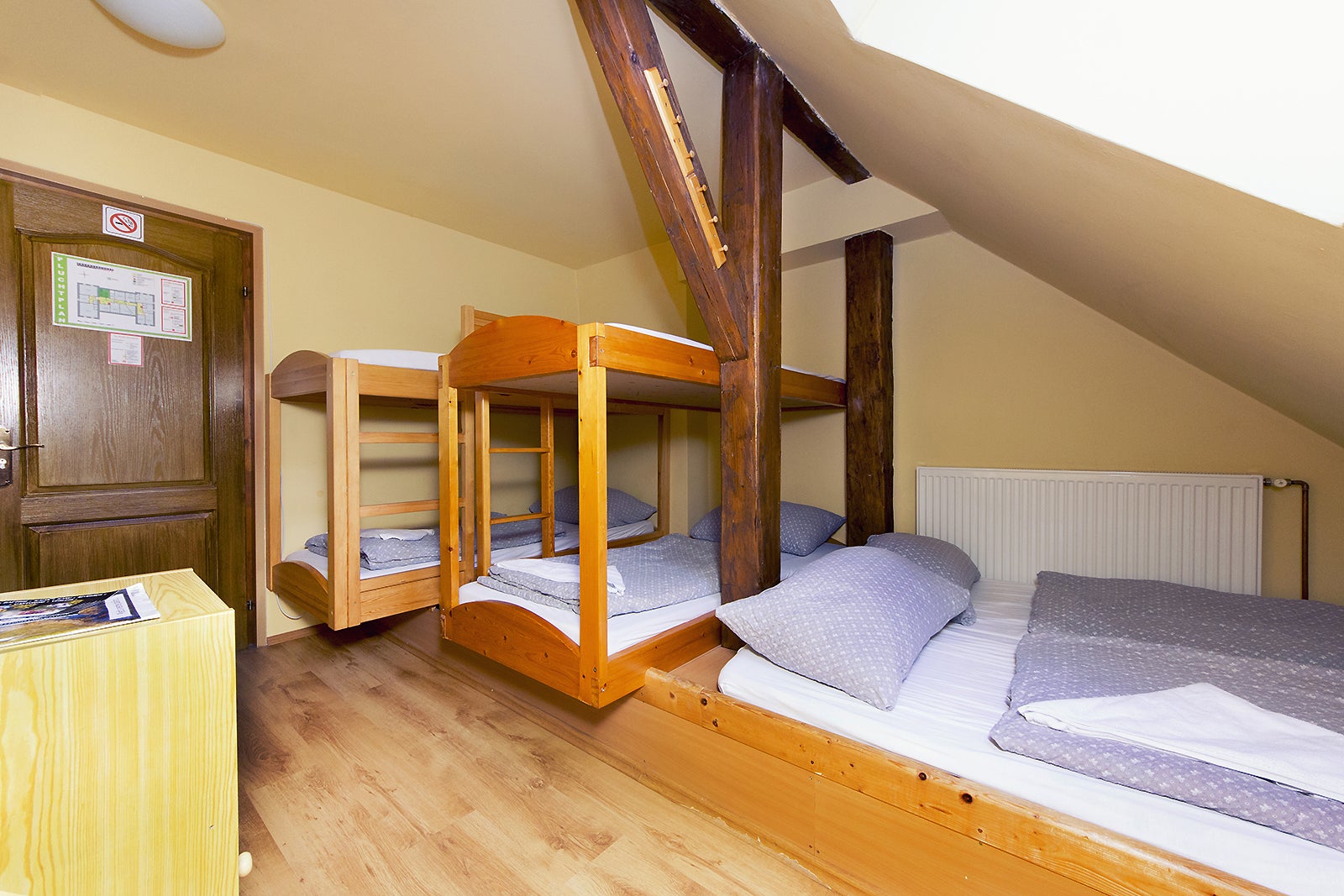 Pokoj č. 3: je orientován na sever směr parkoviště. V pokoji jsou 3 dvoupatrové postele, nabízí tak místo pro 4-6 osob. Ve výbavě pokoje je 1 šatní skříň, stůl s lavicenia koupelna se záchodem, sprchou a umyvadlem.