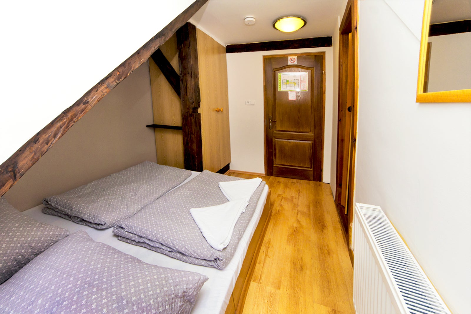 Pokoj č.8: je orientován na sever směr parkoviště a je vybaven střešním oknem. V pokoji je manželská postel, nabízí tak místo pro 1-2 osoby. Ve výbavě pokoje je skříň, křeslo a koupelna se záchodem, sprcha s umyvadlem.