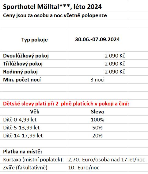*Cena ubytování zahrnuje „Kärnten Card" (Korutanská karta) pro všechny ubytované.