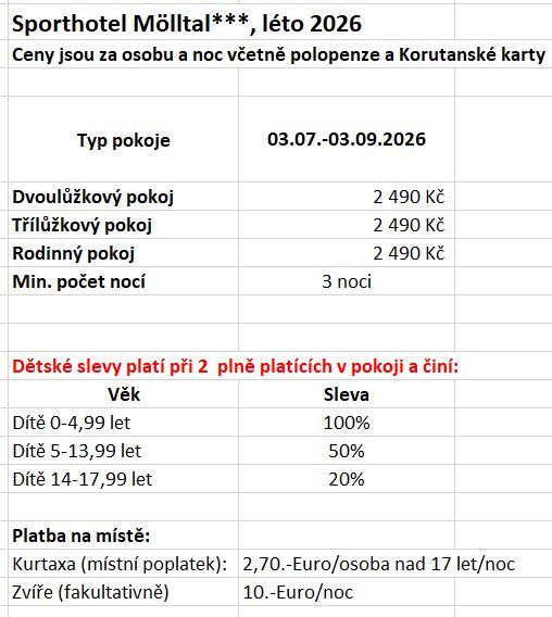 *Cena ubytování zahrnuje „Kärnten Card" (Korutanská karta) pro všechny ubytované.