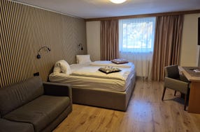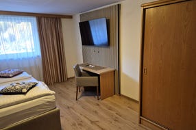 Dvoulůžkový pokoj/Třílůžkový pokoj: pro 2-3 osoby, s manželskou postelí (třílůžkový s postelí navíc), sprcha/WC. Max. Počet osob: 2 dospělí.